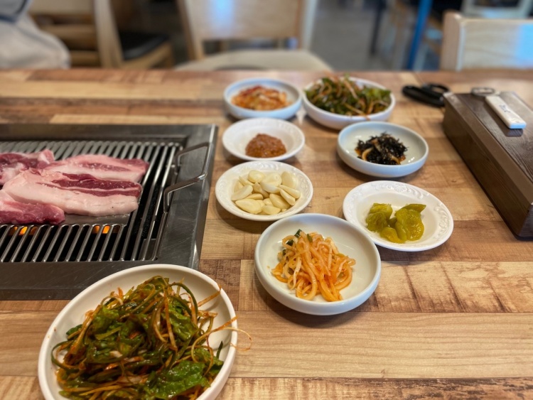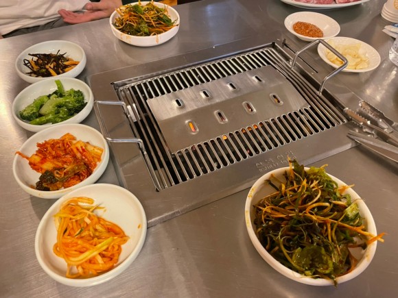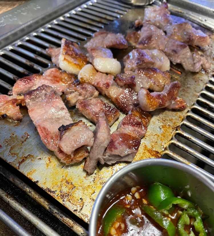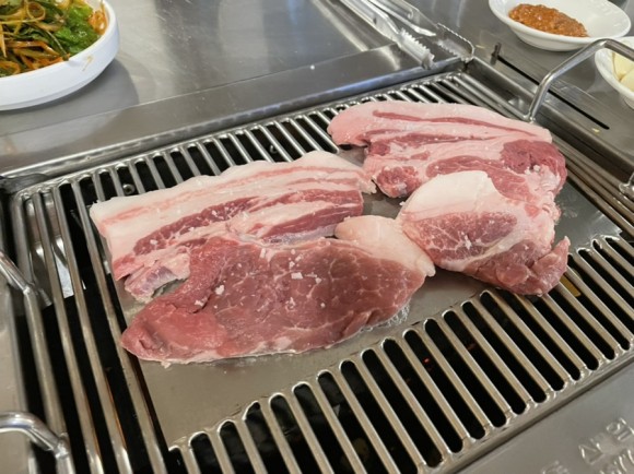 기본 반찬은 나물류 세 가지김치 마늘 나오다. 전체적인 가게 분위기는 좀 조용한 편이어서 편하게 먹을 수 있다. 아주 무심한 듯하면서 사장님께서는 신경을 많이 써주신다. 제주도 고기는 전부 두꺼운 고기인 줄 알았는데, 여기는 다른 지역에서 먹던 것과 같은 두께이다. 처음에 고기는 사장님께서 직접 올려주신다. 가운데 굽고 옆으로 빼면 안 탄다는 말과 함께 잘 구워주신다. 위에 사진처럼 고기에 비계 부분이 많은데 여기 식당 흑돼지의 특징이다. 비계에서 풍겨 나오는 풍미가 좋다. 왜 비계에서 달달한 맛이 꼭 버터맛인 것 같기도 하다. 다른 사람들도 똑같은 얘기를 한다. 일단 먹어봐야 왜 비계에서 버터처럼 고소한 맛이 나는지 알 것이다. 그리고 여기는 된장찌개가 정말 맛있다. 고기보다 더 맛있다는 사람들도 있었다.