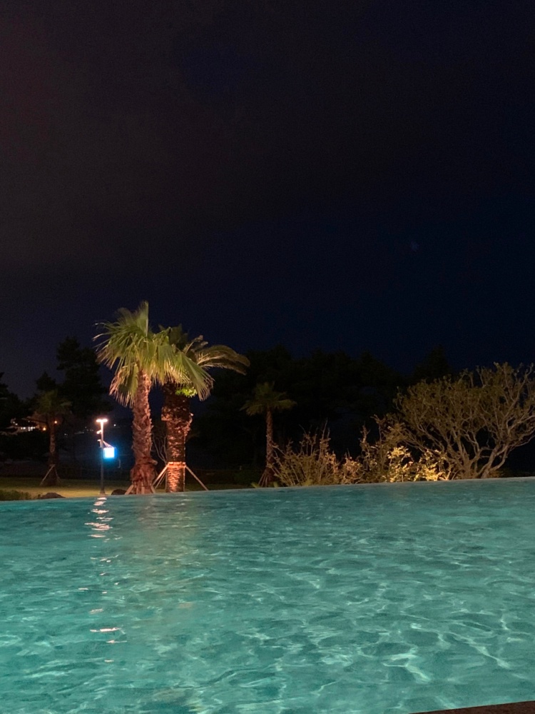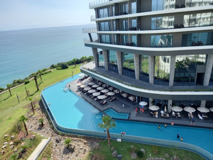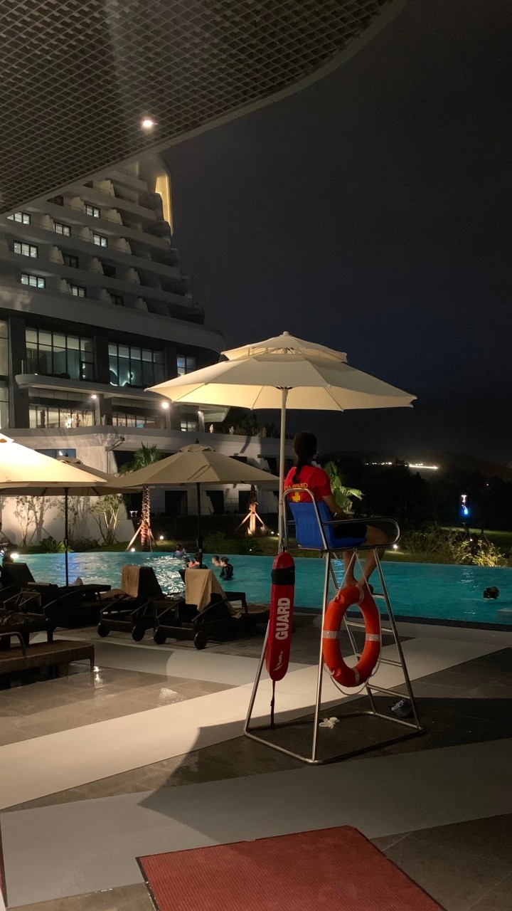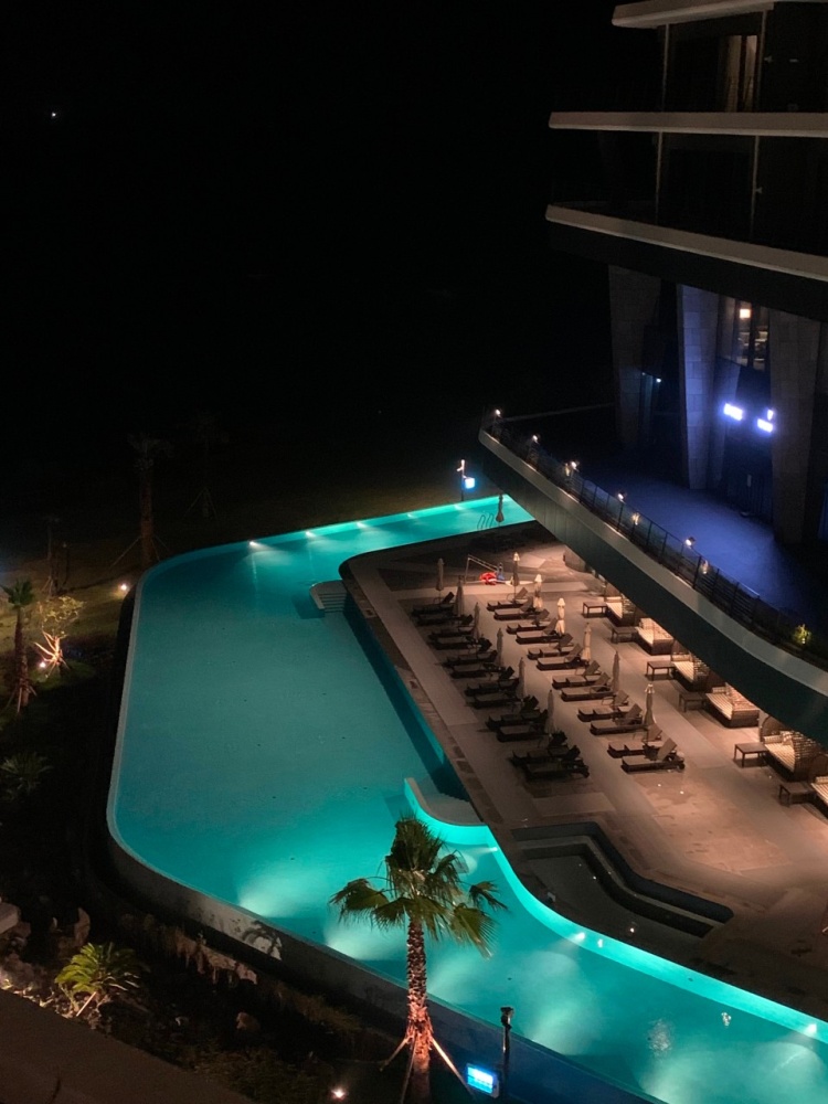 5성급 호텔이라 확실히 다른곳과 비교가 되는 것 같습니다. 복도에 카펫 조차도 컬러풀하니 고급스럽기만 합니다. 인피니티풀은 1층에 있어요. 들어가시는 통로도 안내가 잘 되어 있어서 찾기 쉬워요. 그 길조차 고급스럽기만 해요. 인피티니 풀은 110m의 길이라서 그런지 정말 크네요. 우리를 반겨주는 듯 날씨도 매우 좋았다고 합니다. 수영장은 왼쪽부터 오른쪽으로 쭈~욱 이어지는데 오른쪽으로 갈수록 깊어진다고 하니 주의하셔서 물놀이하셔야 합니다. 날씨가 조금 추우 신부들은 온수풀이 따로 있으니 온수풀에서 몸을 좀 녹이시면 됩니다.